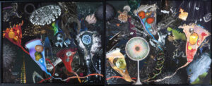 Acrylic paint, graphite, charcoal, and collage on panel,